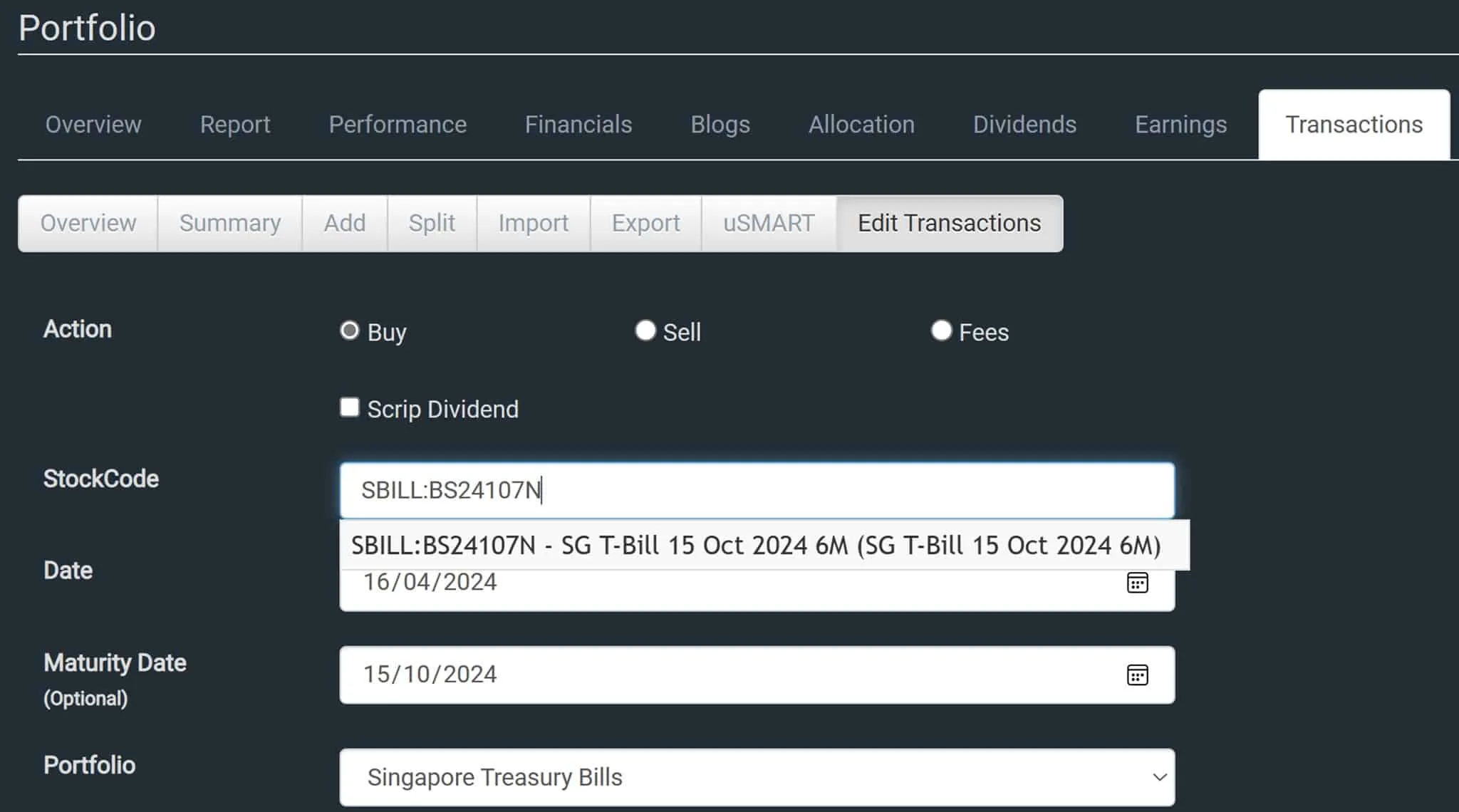 Stocks Café allows you to create portfolios. You can use portfolio to different your investments. For example, I created three portfolios in Stocks Café, namely Stocks, Singapore Savings Bonds and Treasury Bills. This allow me to categorize how much I allocate for each investment.