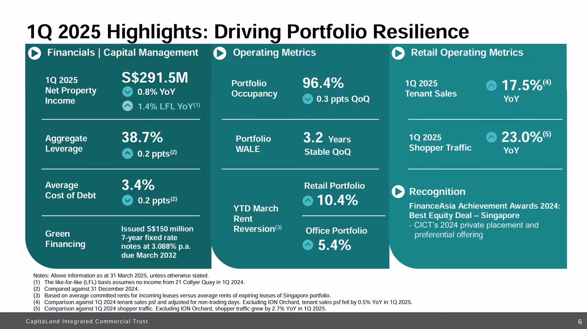 In 1Q 2025, CICT’s gross revenue and net property income declined by 0.8% year-on-year largely due to the absence of income from 21 Collyer Quay which was divested on 11 November 2024. On a like-for-like basis, CICT’s 1Q 2025 gross revenue and net property income were up by 1.1% and 1.4%, respectively. The like-for-like basis assumes no income from 21 Collyer Quay in 1Q2024.