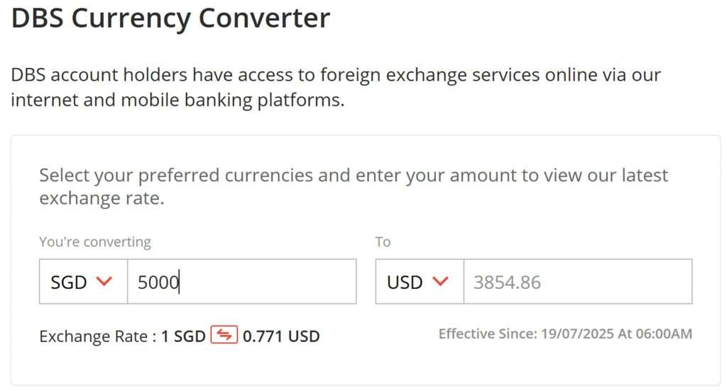 As you can see from the screenshot below, DBS foreign exchange rates are lower as what you can find on google. At this point of writing, 1 SGD convert via DBS currency converter is only equivalent to 0.771 USD. If you google, 1 SGD is equivalent to 0.78 USD.