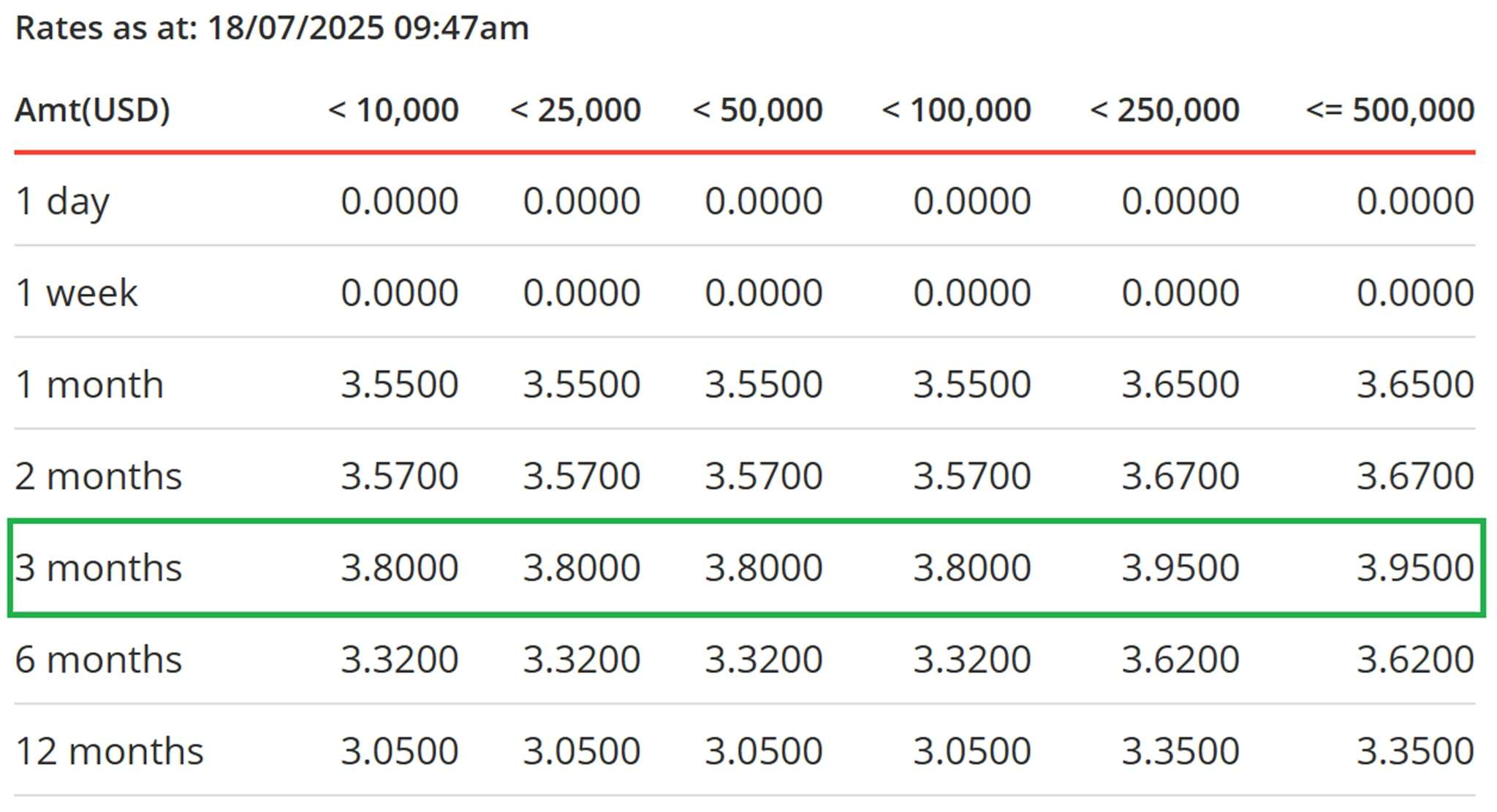 As you can see from the above, the fixed deposit rates for a 3-month placement are the highest as compared to other tenure periods.