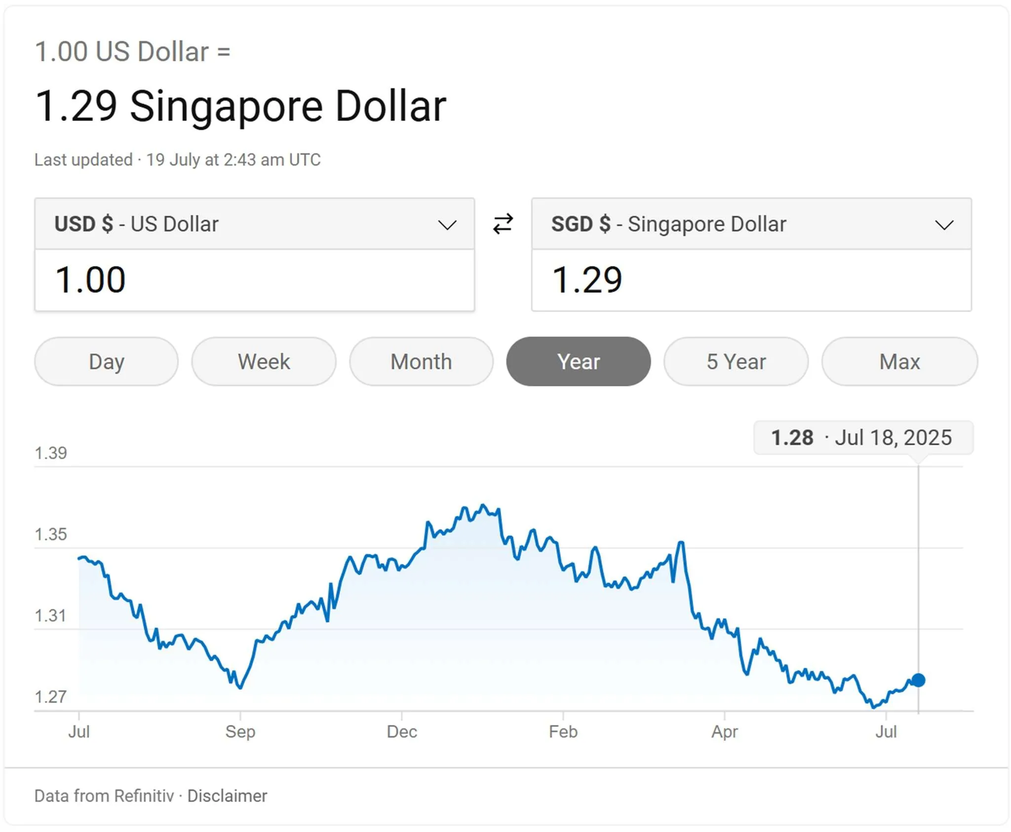 If you look at the below chart on USD to SGD exchange rates, Singapore Dollar is strengthening against the US dollar. In 2025, the Singapore dollar has strengthened 6 per cent to 7 per cent against a weakening US dollar in 2025. This is the strongest year-to-date performance in the last 20 years. It is important to consider the exchange rates from US dollar back to Singapore dollar when your fixed deposit matures.