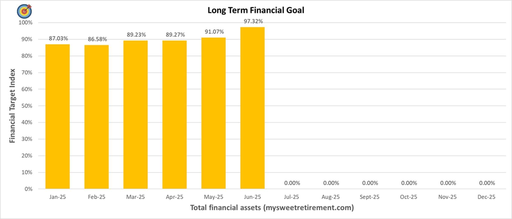 June holidays are almost over, and I am excited to update on my Financial Goals Progress for June 2025. As you can see from the above chart, the total value of my financial assets jumped from 91.07% to 97.32%. This means that I am only 2.68% away from reaching my financial goal that I have set for myself. I will share more details below on what I am doing to achieve my financial goals.