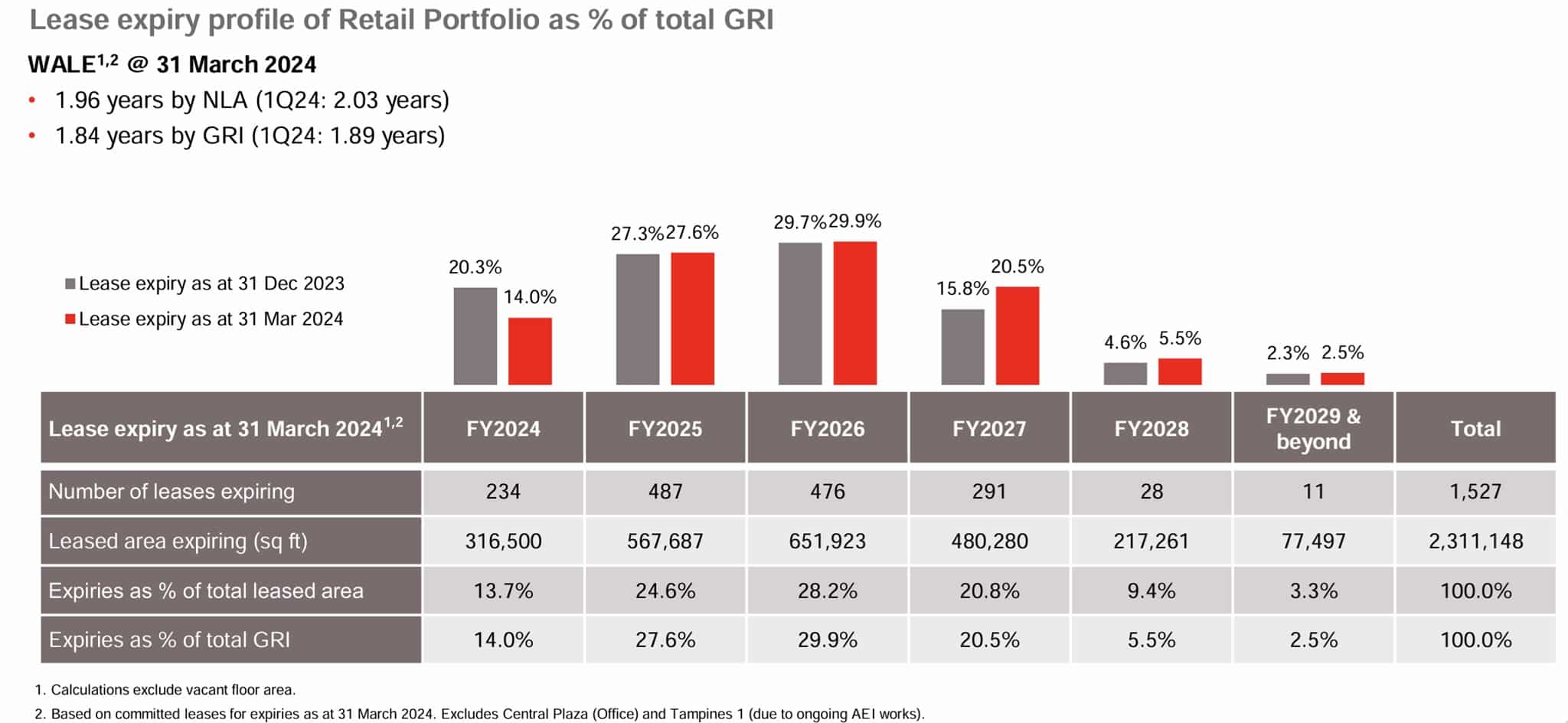 As you can see above, Frasers Centrepoint Trust’s Weighted Average Lease Expiry (WALE) stood short at 1.96 years in terms of Net Lettable Area (NLA). WALE is a metric used in real estate investment to measure the average lease duration of multiple tenants within a property portfolio.
