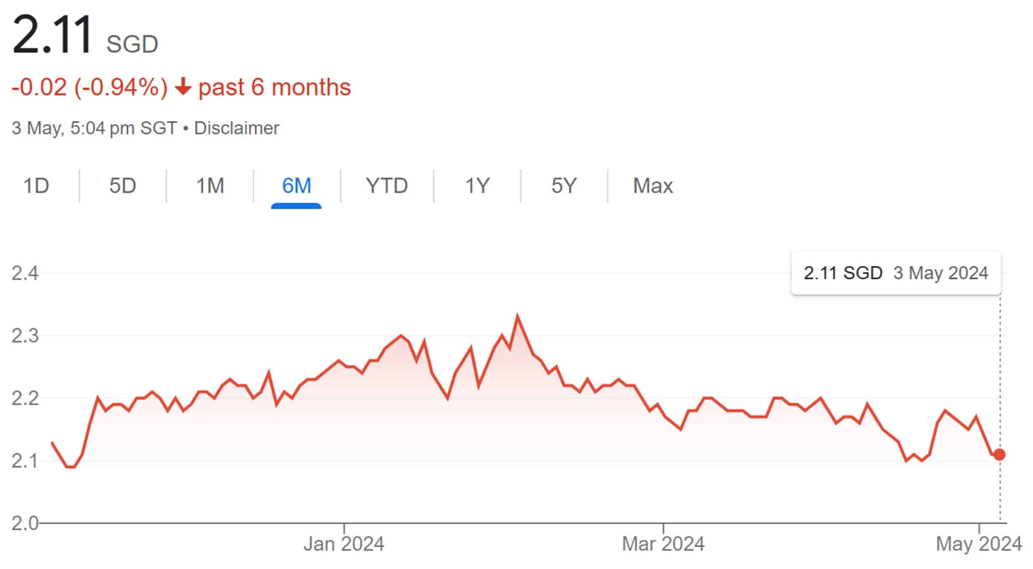 - Current dividend yield is 5.76% based on closing price of S$2.11.