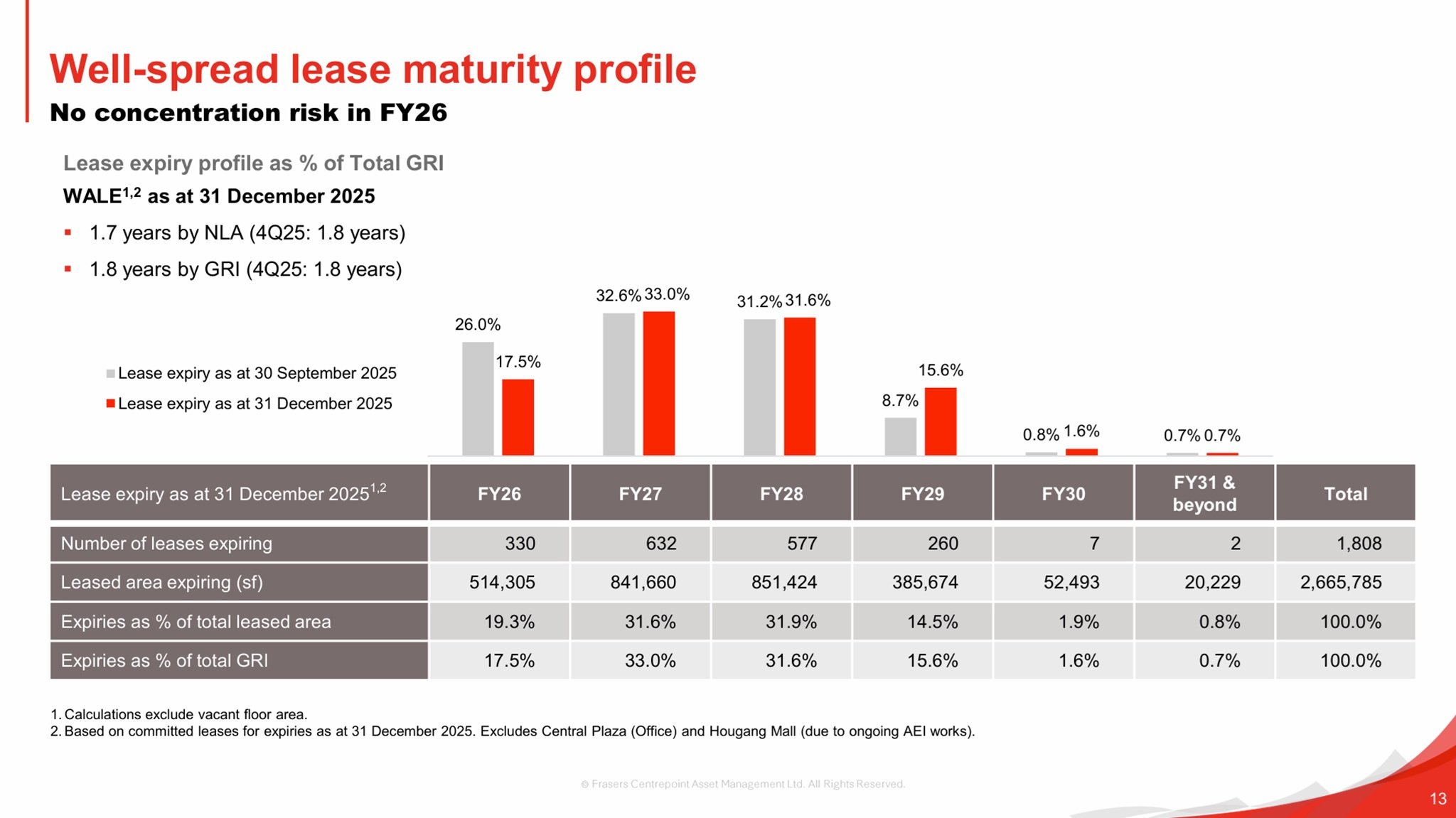 FCT’s lease expiry profile remains well‑spread, reducing concentration risk. As of 31st December 2025, the weighted average lease expiry (WALE) stood at 1.7 years by NLA and 1.8 years by GRI, consistent with the previous quarter.