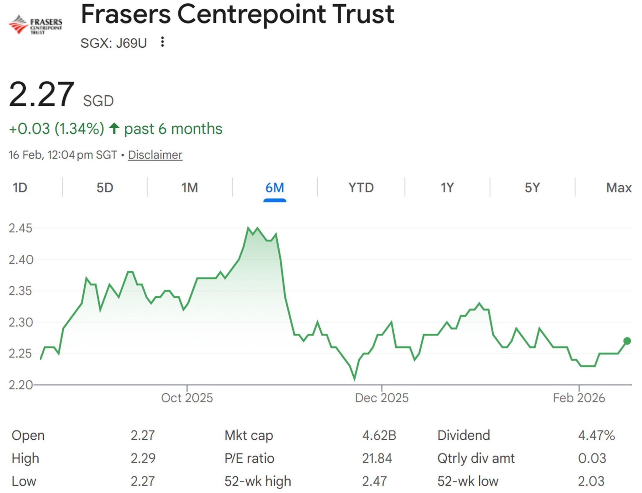 As of the latest available market data, Frasers Centrepoint Trust (SGX: J69U) last closed at S$2.27. Based on its FY25 full year distribution of 12.113 cents per unit, the current dividend yield stands at approximately 5.34%.