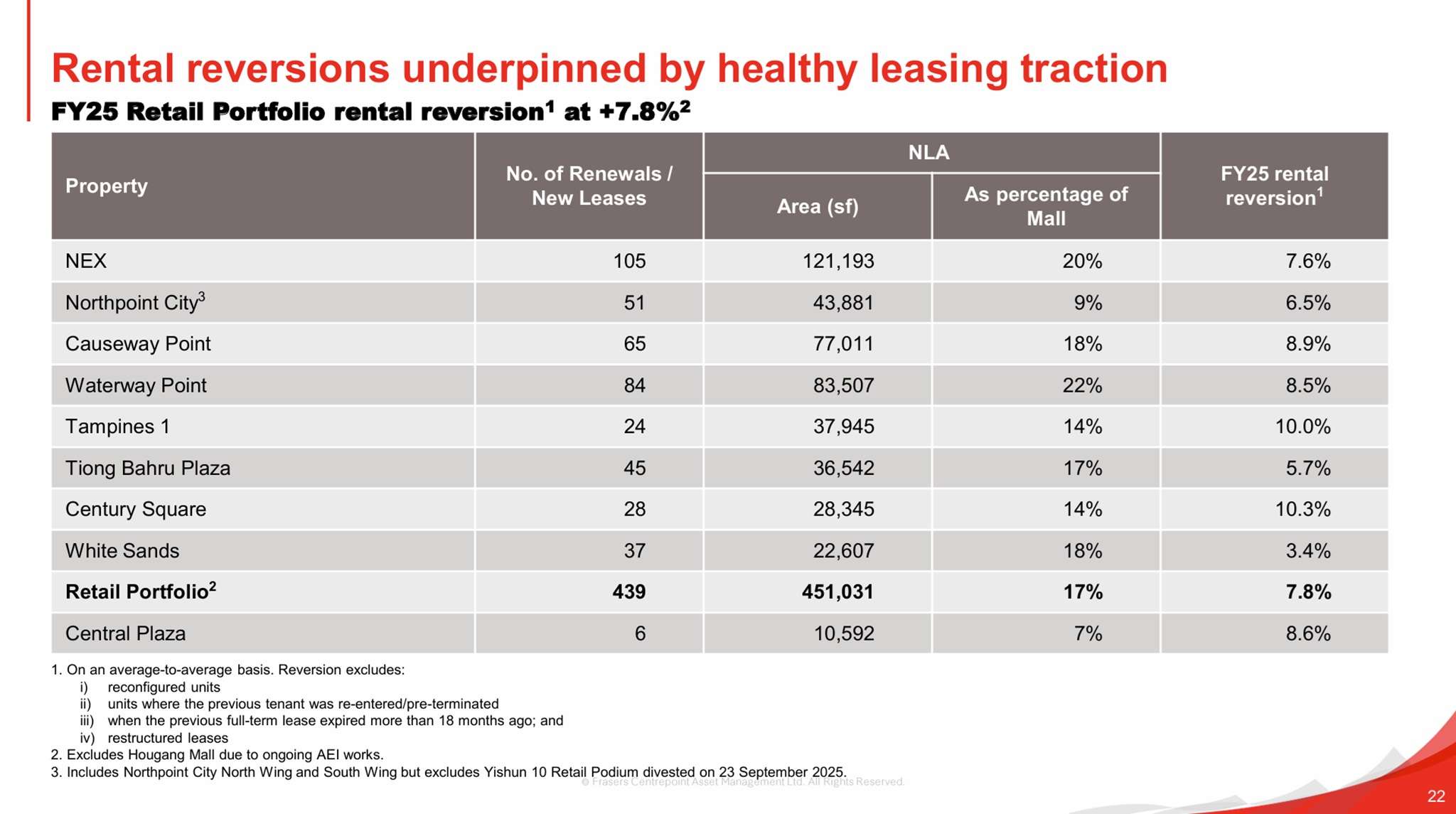 The trust’s gross revenue surged 14.3% year-on-year to S$205.2 million, while net property income (NPI) climbed 12% to S$144.3 million. These gains were primarily attributed to the acquisition of Northpoint City South Wing in May 2025 and the completion of asset enhancement initiatives (AEI) at Tampines 1.