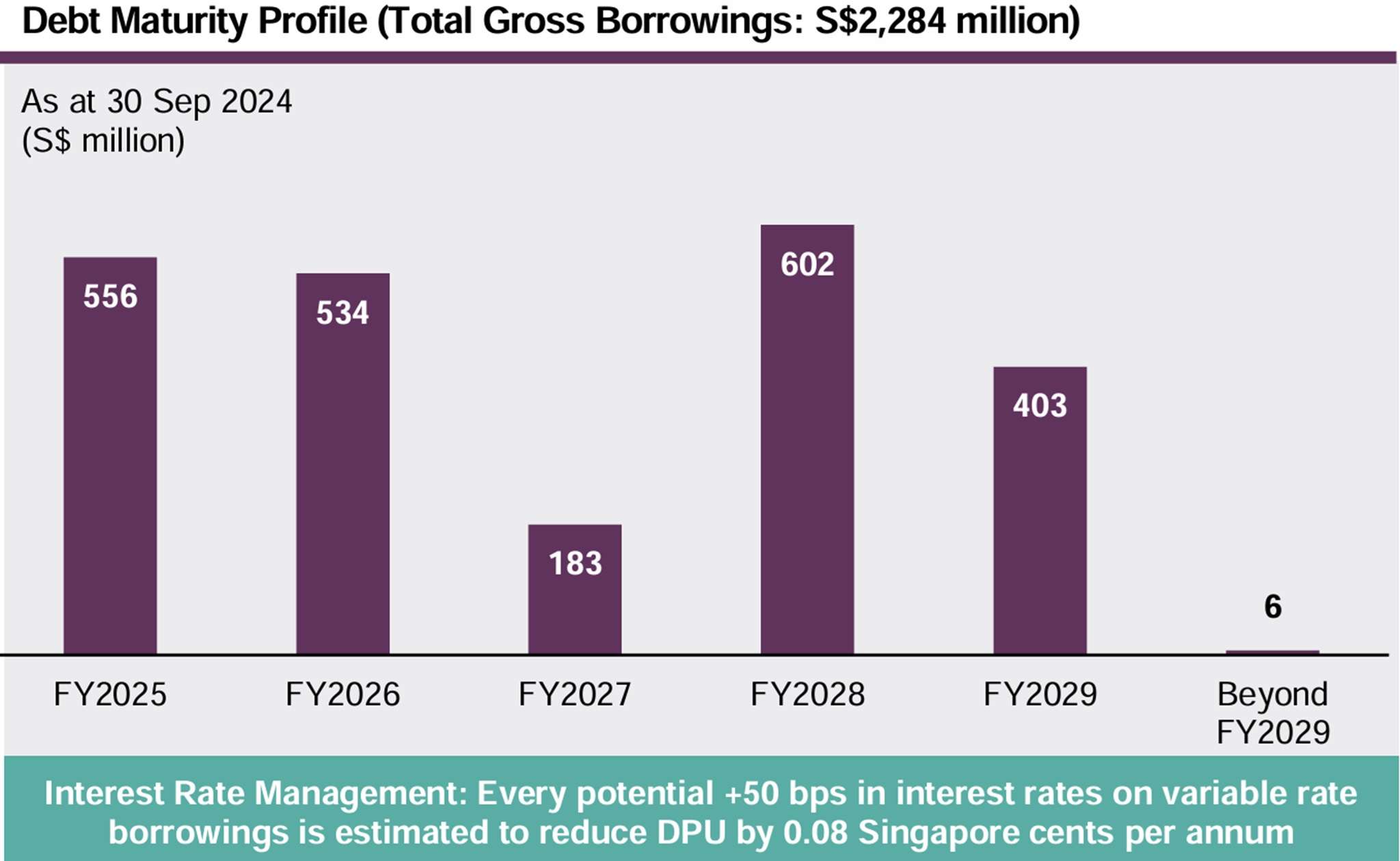 Average weight debt maturity stood at 2.4 years with 73.3% of borrowings hedged at fixed rates to mitigate against sudden interest rate hikes. Debt maturity profile appears to be well-staggered which is important as a well-staggered debt maturity profile is crucial for REITs to manage their debt obligations effectively. By spreading out debt repayments over different time periods, REITs can avoid liquidity crunches and reduce the risk of default.