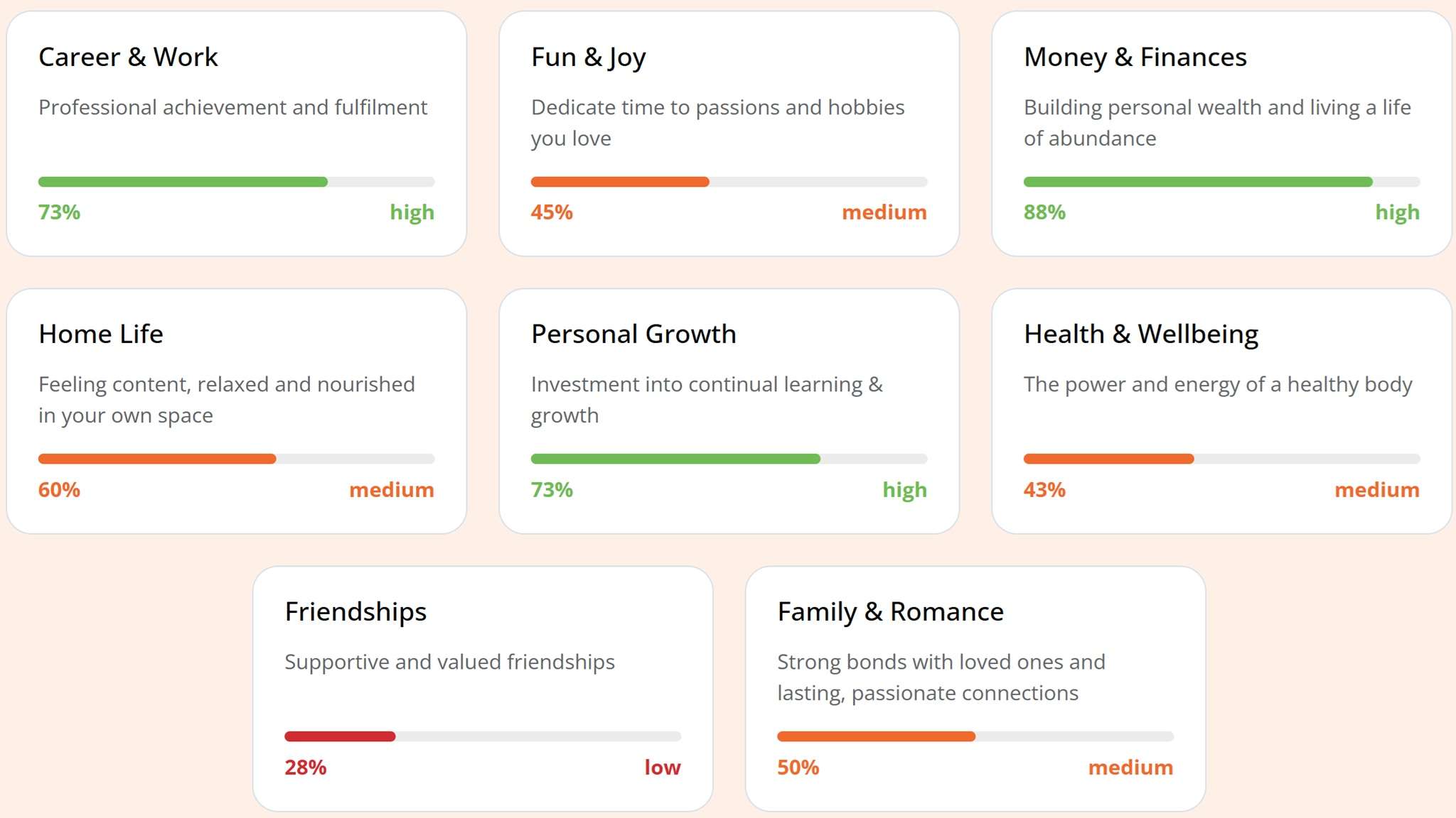Friendships refer to supportive and valued friendships. I scored a low of 28% in this category. In 2025, two of my close friends chose to leave Singapore and start new chapters overseas. I will always treasure the memories we created together. At the same time, I made the conscious decision to distance myself from a few others who were never truly supportive. Their behaviour was draining and often disrupted my inner peace, so I have chosen to limit my contact with them.