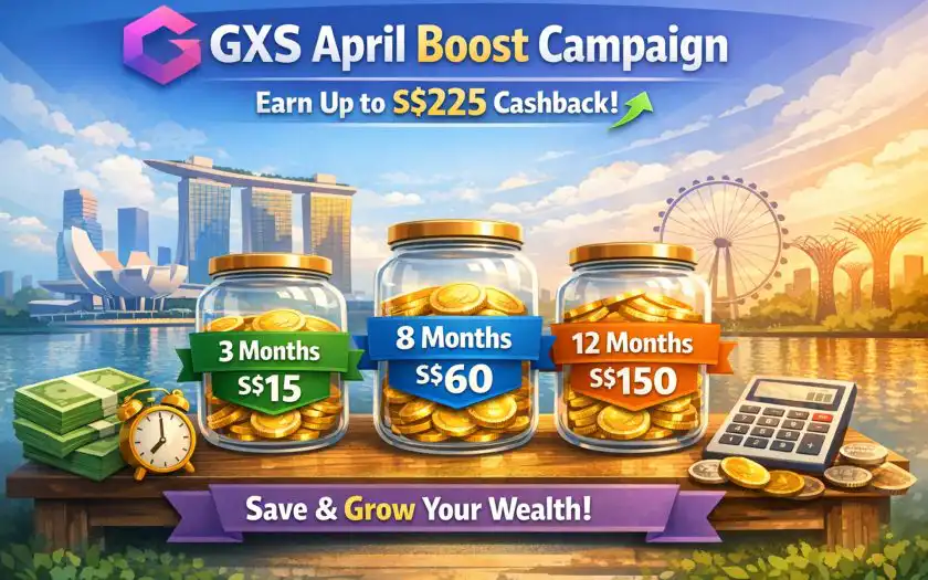 In April 2026, GXS launched the April Boost Campaign, a limited‑time promotion running from 8 April to 20 April. The campaign allows eligible customers to earn up to S$225 in cashback by opening specific Boost Pockets and depositing fresh funds. Both new and existing GXS Savings Account holders can participate, as long as they have not previously closed a GXS account and reopened a new one.