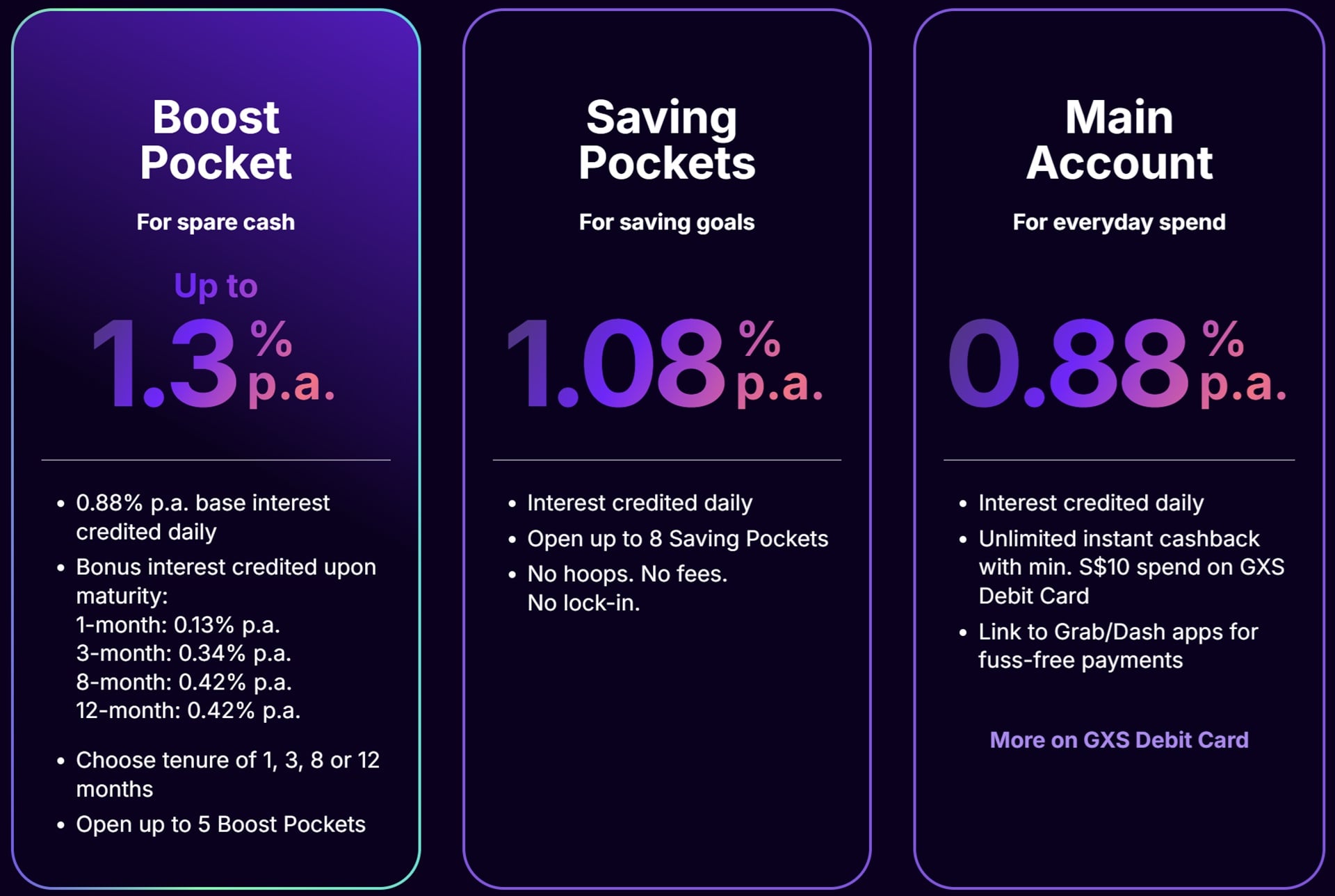 GXS Bank is a digital bank in Singapore designed to make saving simple, organised and rewarding. Instead of relying on traditional fixed deposits, GXS uses a pocket‑based system. Your main Savings Account holds your core balance, while Savings Pockets help you organise money for different goals. Boost Pockets are special pockets that offer promotional rewards for a fixed tenure, functioning like short‑term locked savings with bonus incentives. They are easy to set up and ideal for customers who want predictable returns without the complexity of investment products.