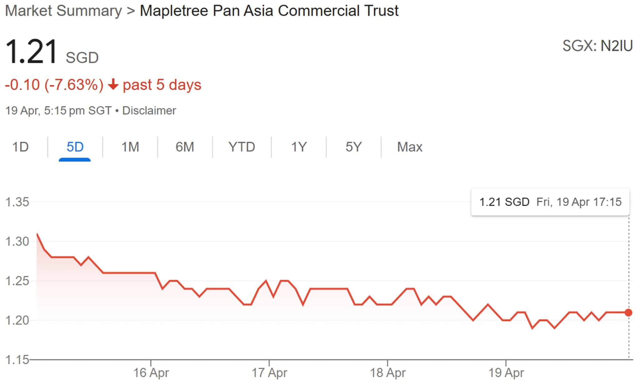 In a week, the share price of MPACT (Mapletree Pan Asia Commercial Trust) has fallen as much as 7.63% to end the week at S$1.21. Based on MPACT’s current closing share price of S$1.21 and FY22/23 full year distribution of 9.61 cents, this translates to a current dividend yield of 7.94%.