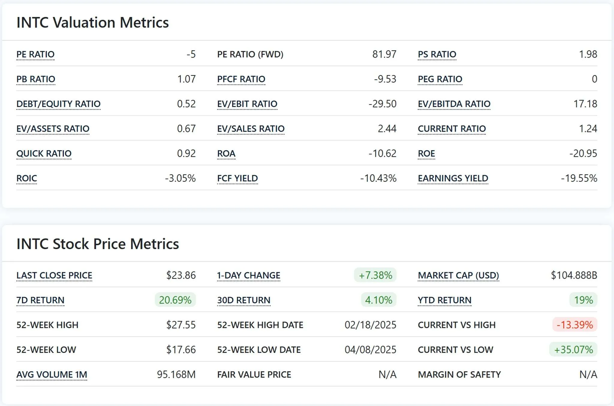 Intel’s net loss for the quarter totalled $2.9 billion, largely attributed to a trio of extraordinary expenses. The company incurred $1.9 billion in restructuring charges as it aggressively streamlined operations, including workforce reductions and facility consolidations. An additional $800 million in impairment charges and $200 million in miscellaneous one-time costs further weighed on the bottom line. The 3 year average growth rate is -10.27% and the 5 year CAGR is -7.63%.