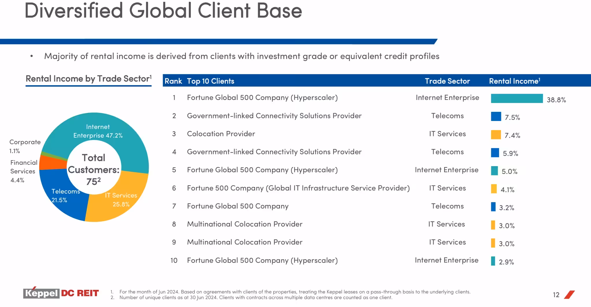 - Keppel DC REIT’s portfolio occupancy stood healthy at 97.5%. 38.8% of Keppel DC REIT’s rental income comes from Fortune Global 500 Companies (Hyperscaler).