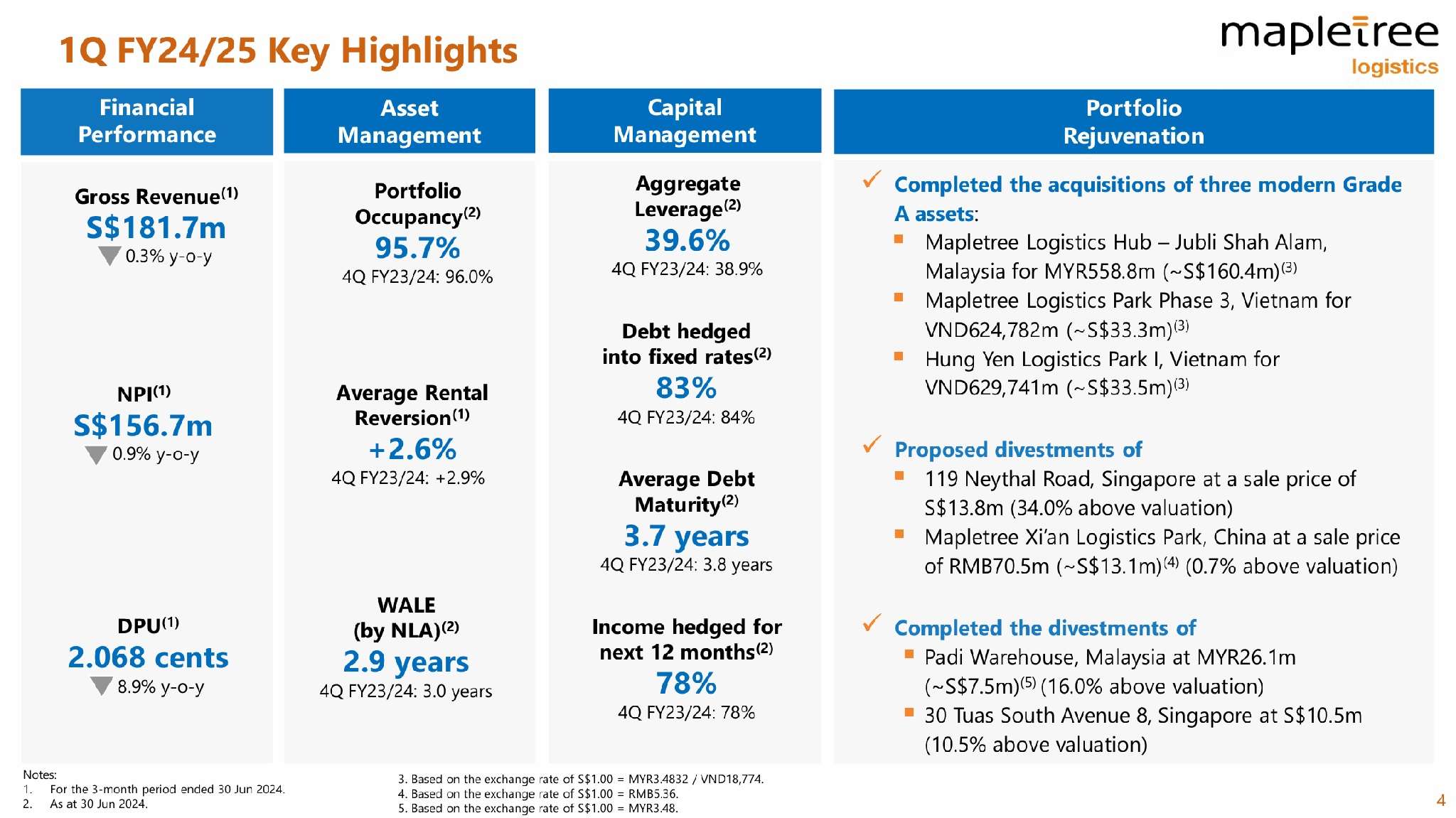 Summary of Mapletree Logistics Trust 1QFY24/25 Financial Results