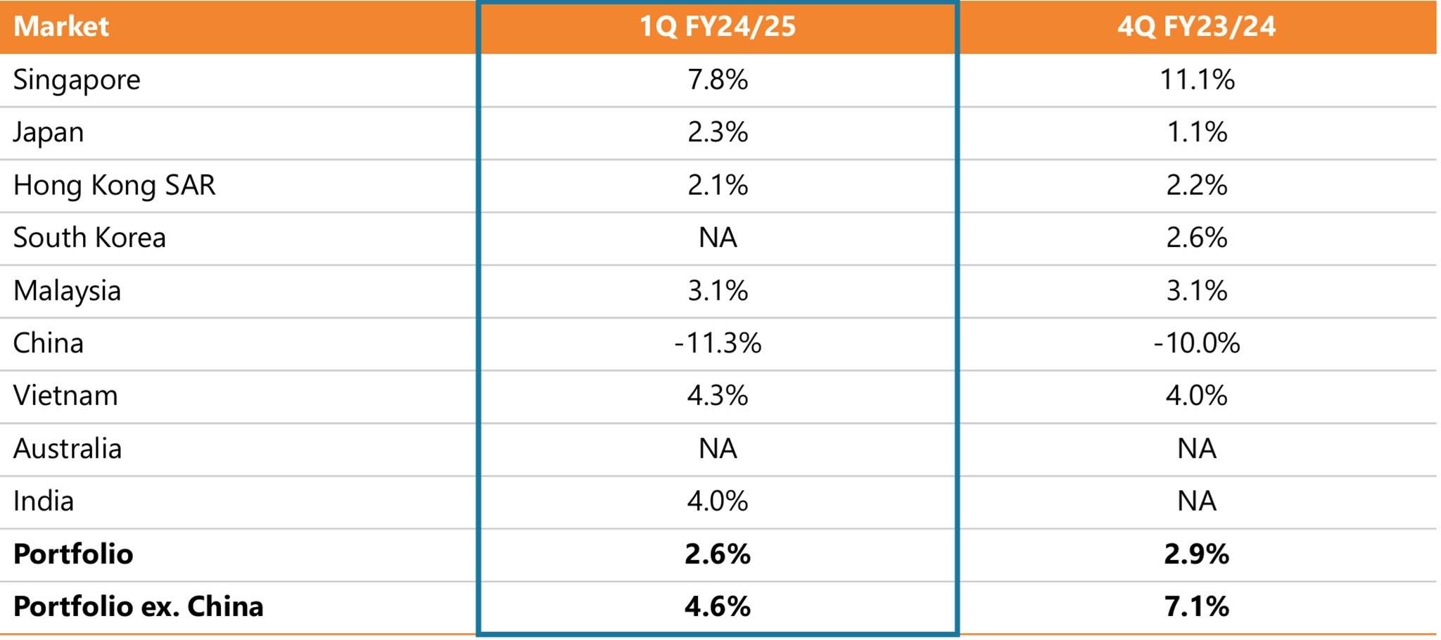 - Achieved positive rental reversions of 2.6% for leases renewed in 1QFY24/25.