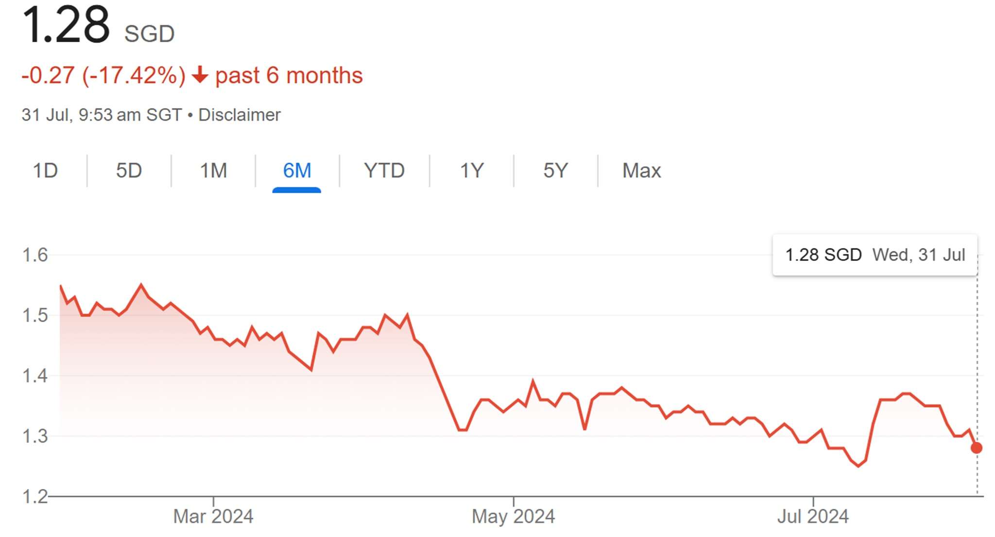 As you can see from the above chart, Mapletree Logistics Trust share price has been on the downtrend over the past 6 months. Mapletree Logistics Trust share price currently stood at S$1.28 on Wednesday, 31st July 2024. Based on the Mapletree Logistics Trust dividend of 9.003 cents in FY23, Mapletree Logistics Trust’s current dividend yield is 7.03%.