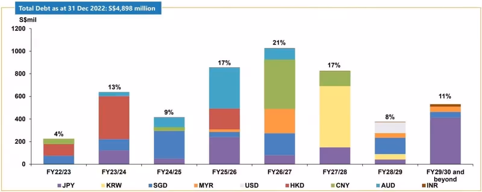 The manager shared that they have sufficient available committed credit facilities of S$1,181 million to refinance S$863 million (or 17% of total debt) debt due in FY22/23 and FY23/24.