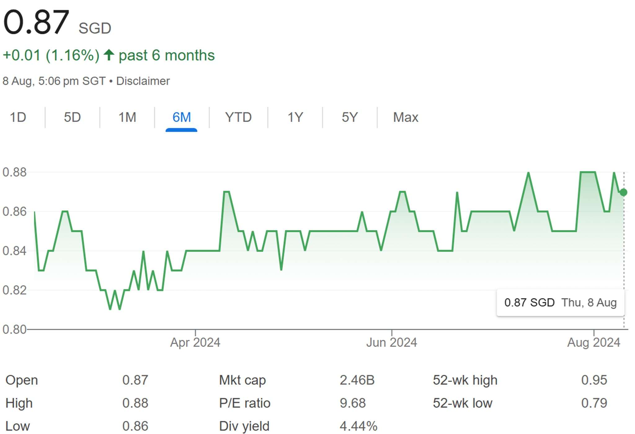 Based on the 6-months chart above, you can observe that PARAGON REIT share price has been on an uptrend. Based on PARAGON REIT share price of S$0.87 on 8th August 2024 and FY2023 full year distribution of 5.02 cents, this translates to a current dividend yield of 5.77%.