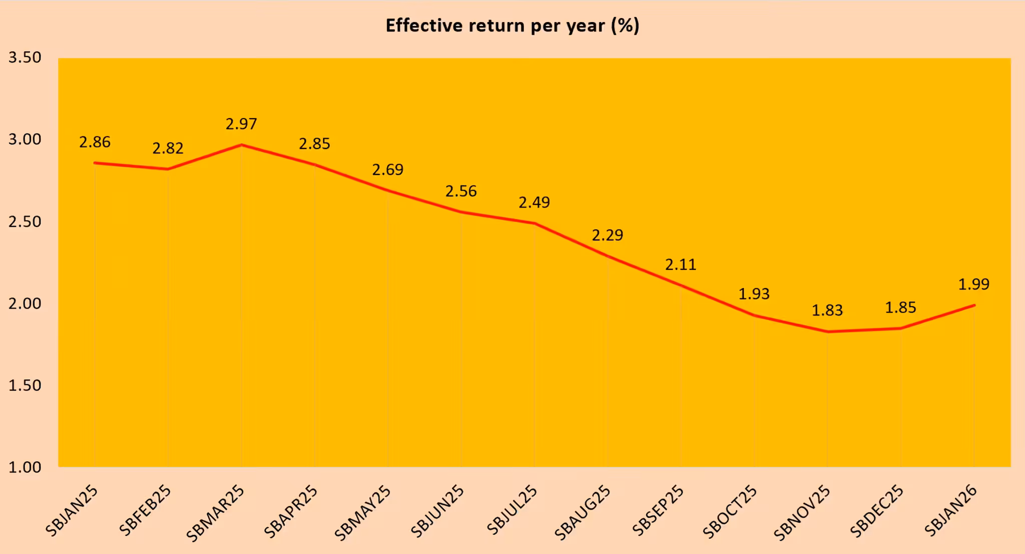This month’s issue of Singapore Savings Bonds (SBJAN26) gives you a decent effective return of 1.99% p.a. over 10 years.