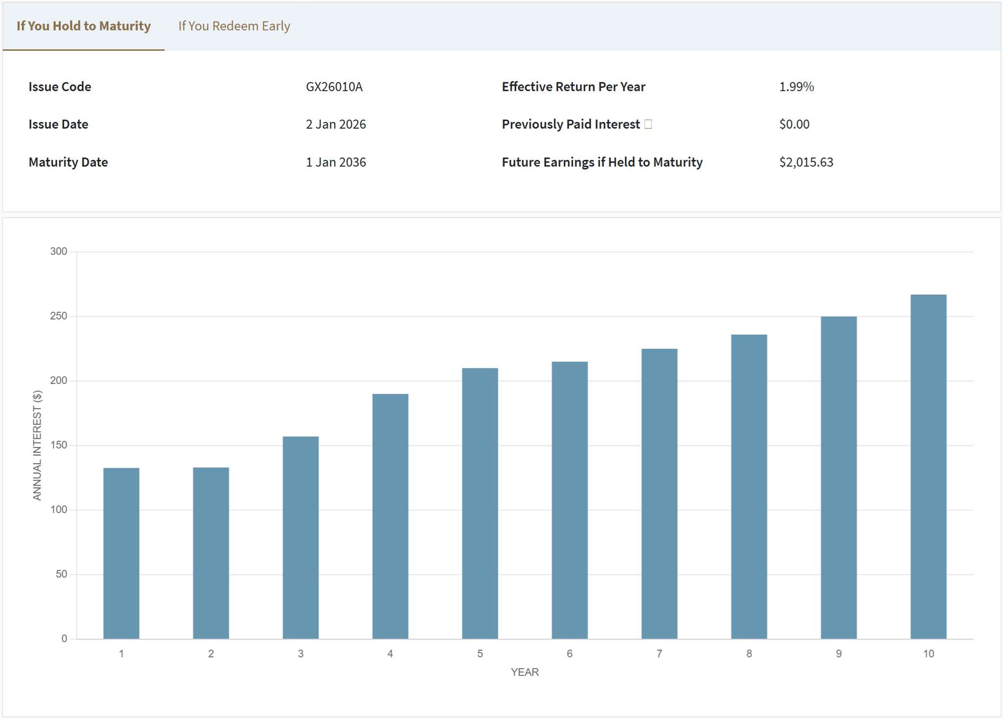 For example, if you invest S$10,000 in the SBJAN26 (GX26010A) tranche and hold it to maturity, your total interest earned would be S$2,015.63. Here is a breakdown of the annual interest payouts for SBJAN26 (GX26010A) across its 10-year term.