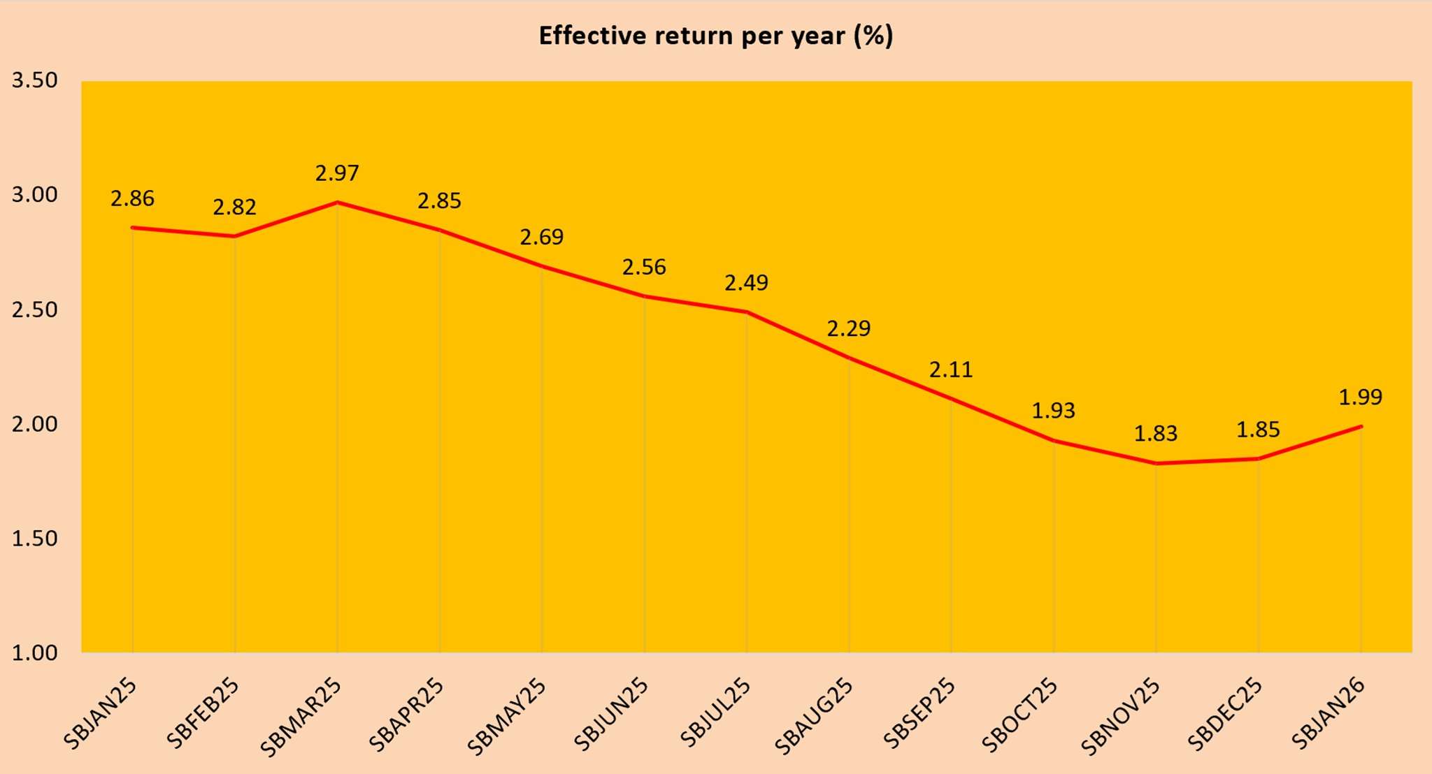When I first looked at the numbers for the latest Singapore Savings Bond, SBJAN26 (GX26010A), I could not help but compare them to what the banks are offering right now. A one‑year holding gives me 1.33% per annum, while committing for the full 10 years locks in an effective 1.99% per annum. It may not sound dramatic, but in today’s environment where savings accounts and fixed deposits are sliding lower, those figures carry weight.