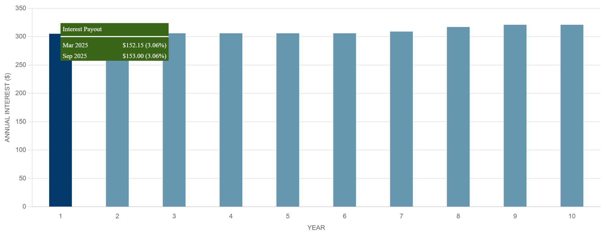 Let us use an investment of S$10,000 as an example. If you purchase SBSEP24 GX24090E and held it for 10 years, you will receive a total earning of S$3,103.15. Based on the chart generated from the Savings Bonds Interest Calculator, you will receive an estimate of S$305 per year until maturity in September 2034 depending on the interest rate for that year.
